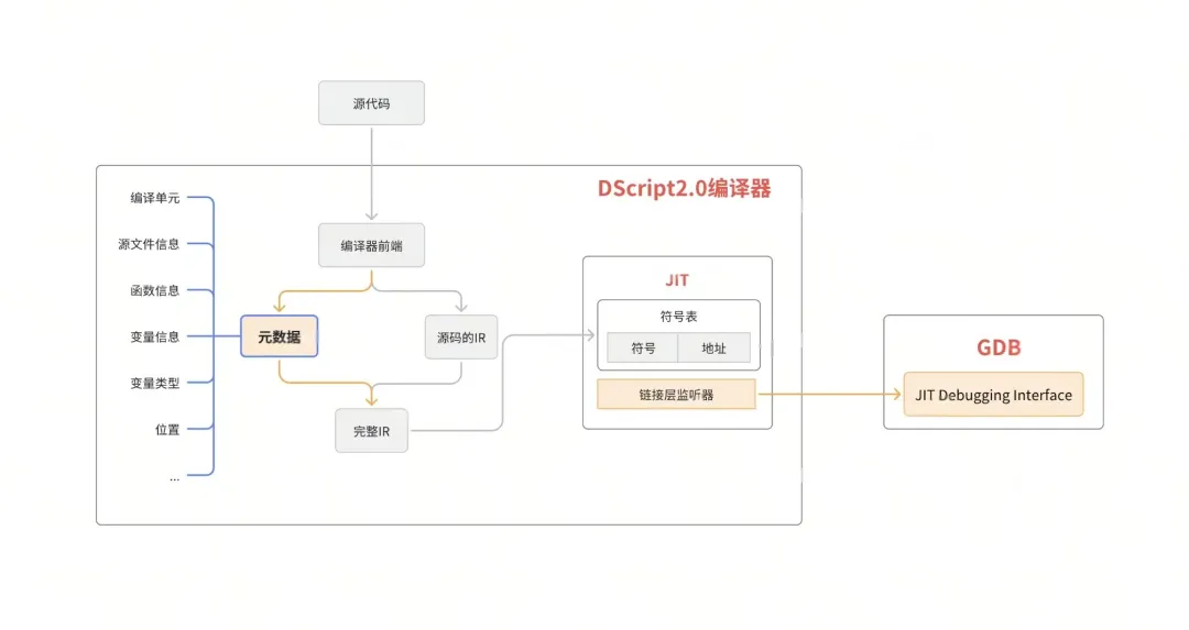 调试能力的实现主要基于GDB的通用调试接口,在编译DScript2.0源码时,生成调试信息,插入到LLVM IR的元数据中,然后通过JIT的监听器挂载GDB调试接口,并注入调试信息,最终实现调试能力。