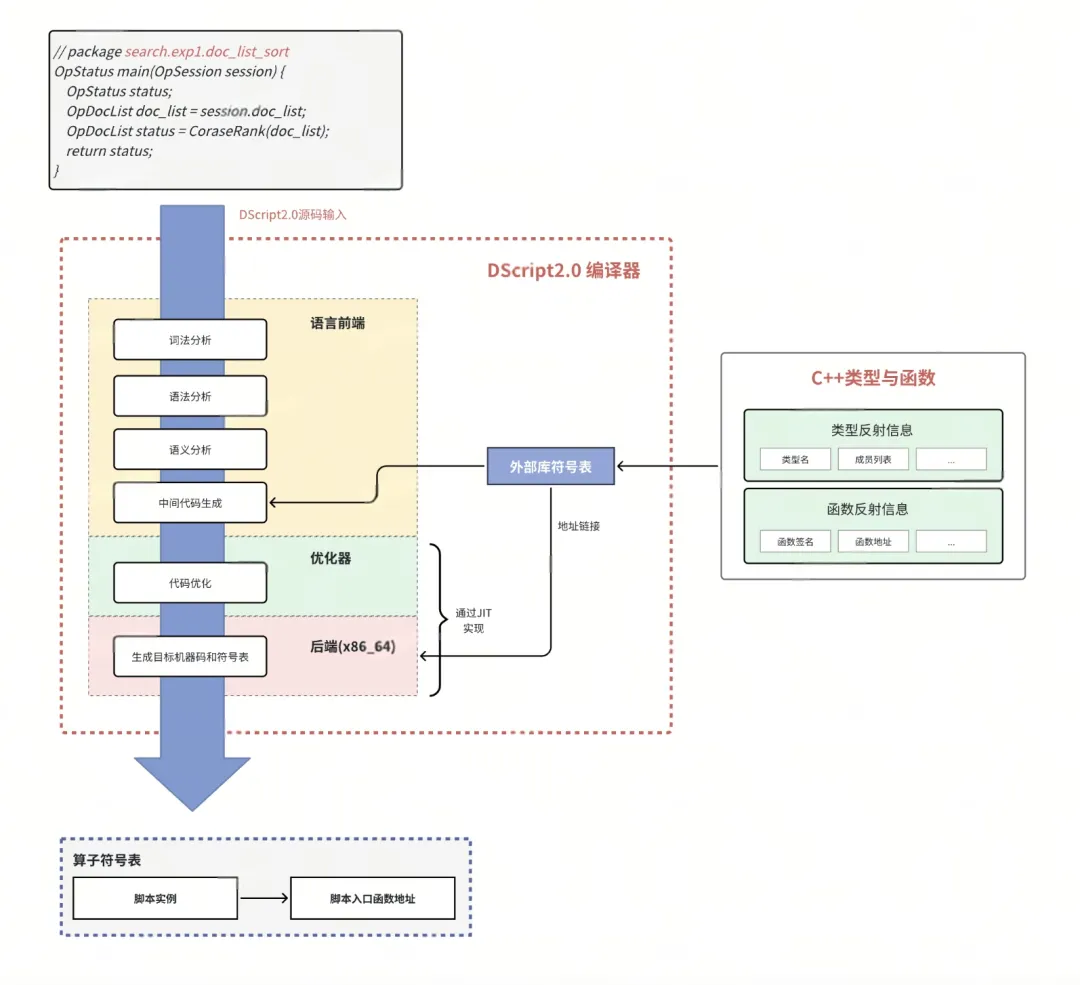 DScript2.0 使用 LLVM 的 ORC JIT 作为即时编译器的实现,支持在程序运行时编译脚本,并通过查找函数地址的方式执行脚本。