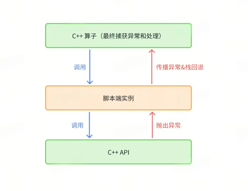因为DScript2.0的语言互操作性特性,会涉及到C++与DScript2.0的函数互相调用(如下图所示),就会涉及到异常处理时,异常在C++和DScript2.0之间传播,即所谓跨语言边界。