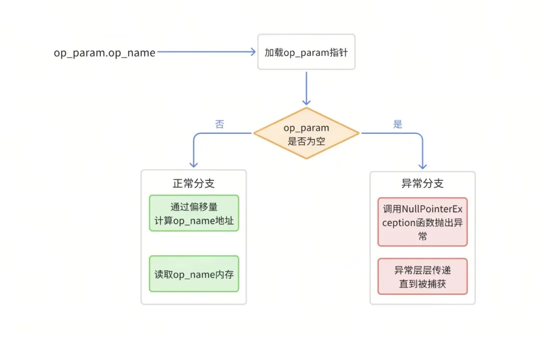 例如下图所示,在编译阶段,编译器对于结构体指针进行了空引用检查逻辑,将硬件异常转换为了主动异常,而主动异常可以通过捕获来进行处理,避免了进程崩溃。