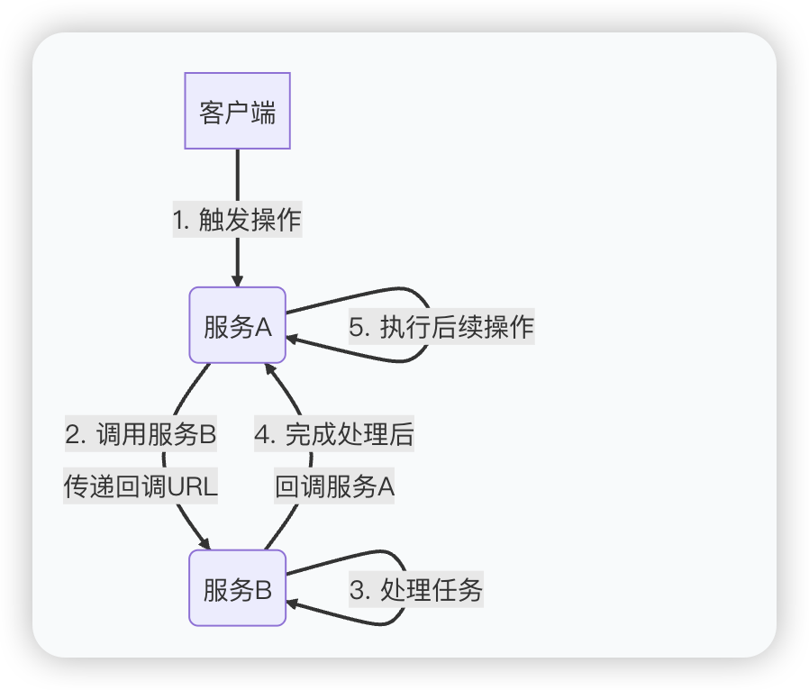 回调(Callback)是一种常见的异步编程模式,主要用于服务间的异步通信。当服务A需要服务B执行某个耗时操作时,服务A不会一直等待服务B完成,而是提供一个回调地址,服务B完成操作后主动通知服务A。