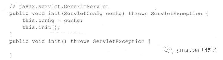 2.提供了无参的init方法 GenericServlet实现了Servlet的init(ServletConfig config)方法,在里面将config设置给了其内部变量config,然后调用了无参的init方法;此方法可以在子类中通过覆盖它来完成初始化工作。