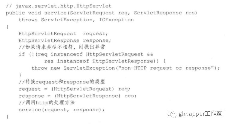 HttpServlet是基于Http协议实现的Servlet的基类,写Servlet时直接继承HttpServlet即可,不需要再重头实现Servlet接口,SpringMvc中的dispatcherServlet就是HttpServlet的子类。 HttpServlet是与Http协议相关的,HttpServlet处理请求主要是通过重写父类的service方法来完成具体的请求处理的。在service方法中首先是将ServletRequest和ServletResponse转换成HttpServletRequest和HttpServletResponse,然后根据请求的不同路由到不同的处理过程中去【处理方法就是我们常见的doXXX的方法。最常见的就是doGet和doPost】