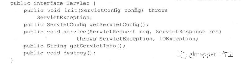 因为Servlet是以规范的方式存在的,实际上就是定义一系列规范接口。在Servlet接口中,主要包括以下几个接口: