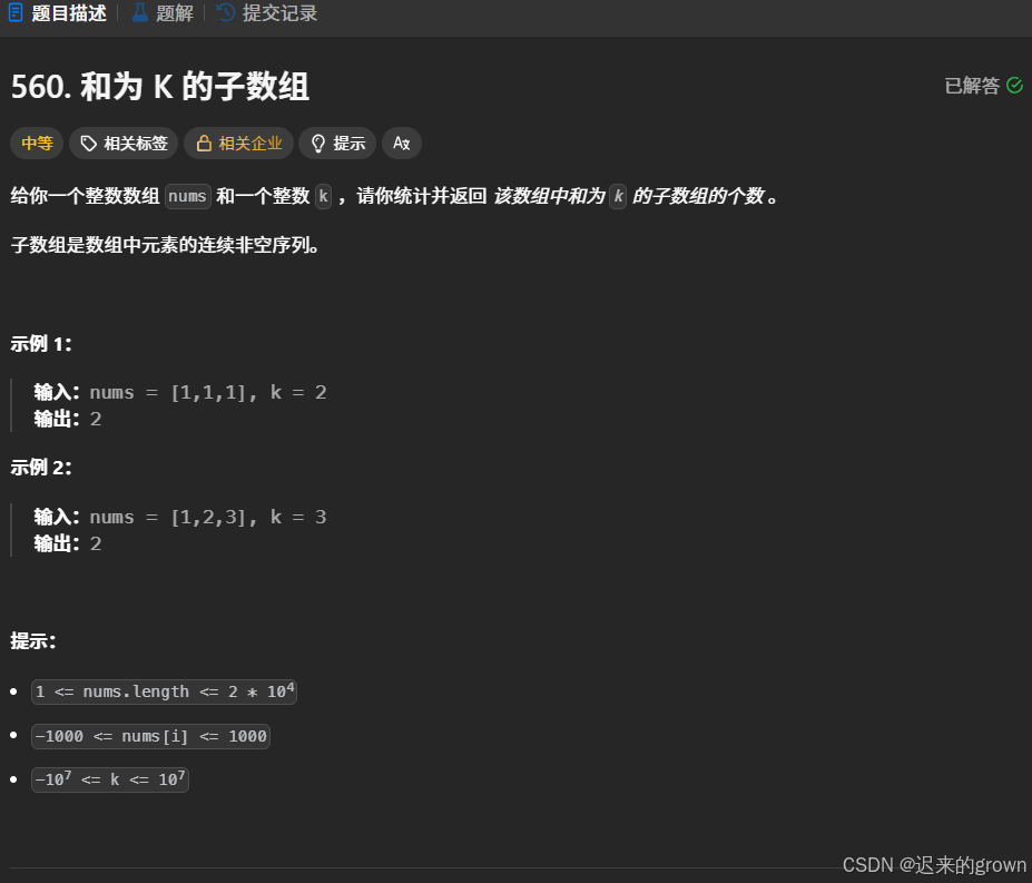 nums和一个整数k我们要求在nums数组中存在多少个和为k的子数组。 注意:这道题中给的的数据范围:-1000 <= nums[i] <= 1000