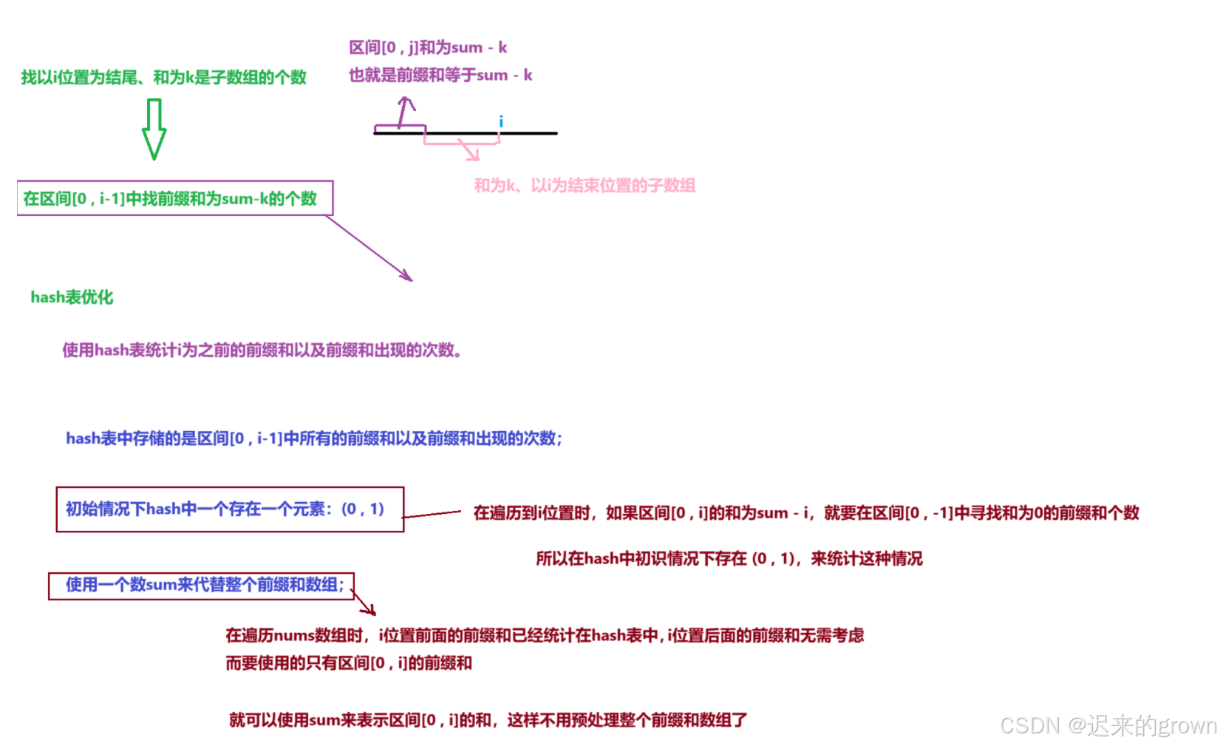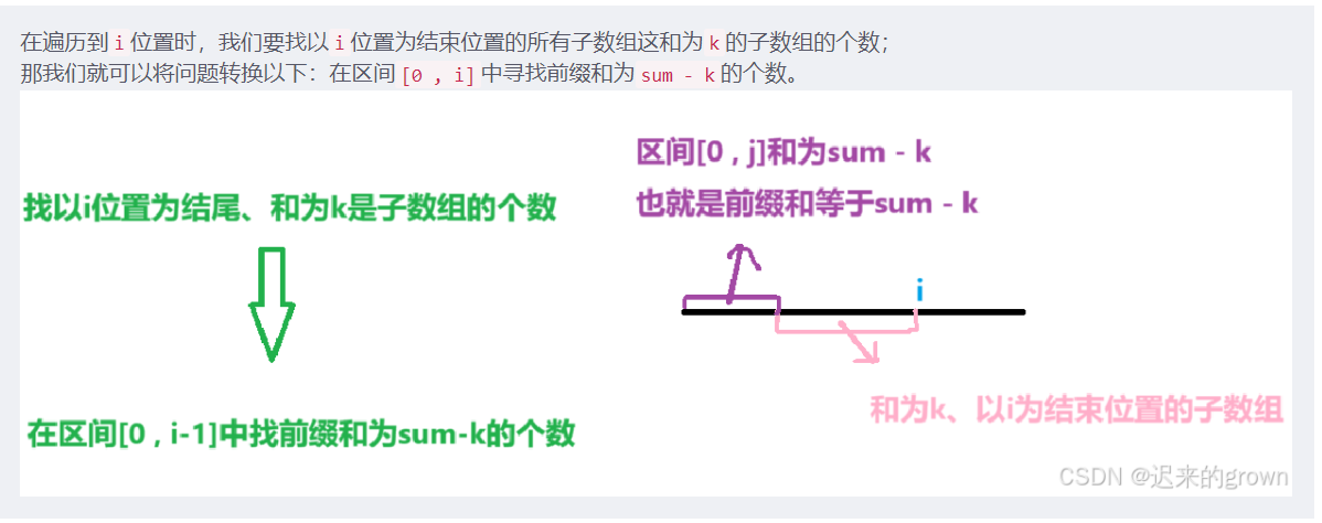 i位置时,我们要找以i位置为结束位置的所有子数组这和为k的子数组的个数; 那我们就可以将问题转换以下:在区间[0 , i]中寻找前缀和为sum - k的个数。