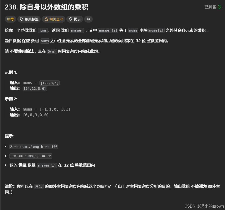对于这道题,要返回数组answer,其中answer[i]表示除了nums[i]以外的所有数的乘积。