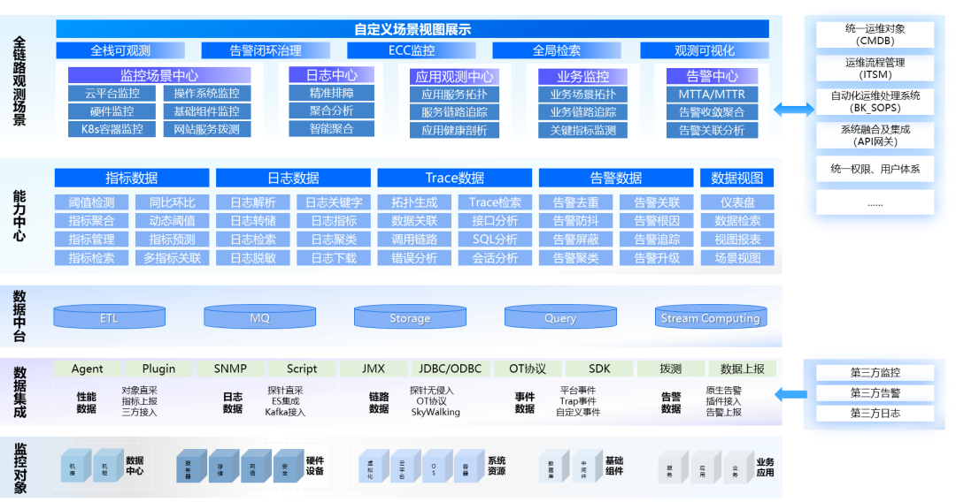 嘉为蓝鲸提供一站式端到端全链路监控产品,包含监控中心、日志中心、应用性能监控、业务监控、告警中心五个产品模块。通过指标(Metrics)、追踪(Traces)、日志(Logs)作为观测支柱数据,数据采集能力覆盖网页Web、后端应用、软件与操作系统、容器和虚拟化、主流硬件等。同时,鲸眼提供一站式的排障能力,支持统一告警与统一展示,以智能化手段降低故障排查难度,提升排障效率,为企业提供全栈智能可观测平台解决方案。