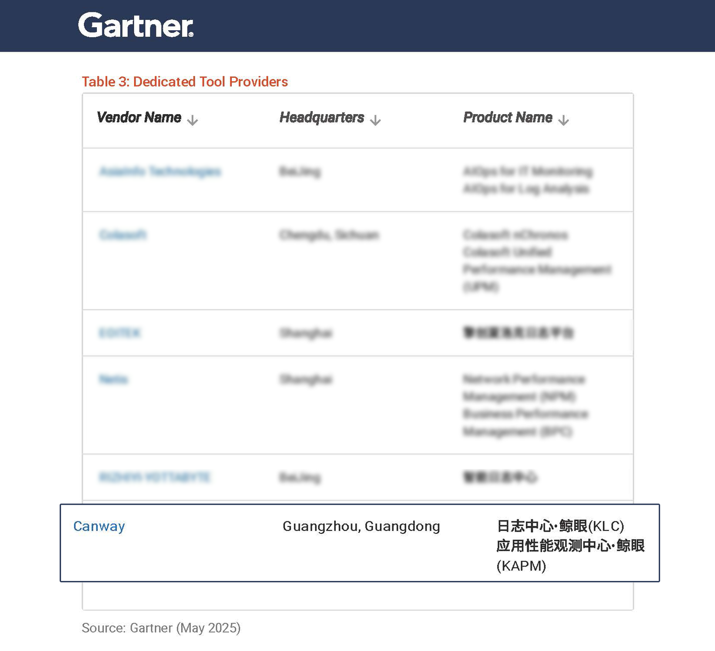 2025年5月,国际研究机构Gartner发布了《中国智能IT监控与日志分析工具市场指南》(Market Guide for Intelligent IT Monitoring and Log Analysis Tools in China),嘉为蓝鲸全栈智能可观测中心·鲸眼凭借嘉为蓝鲸日志中心与嘉为蓝鲸应用性能观测中心(APM)两大优秀产品成功入选专用工具提供商(Dedicated Tool Providers)。