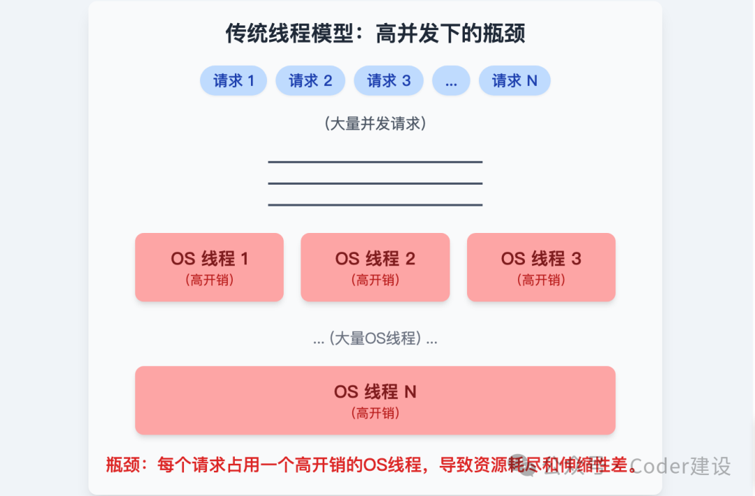 Java 长久以来依赖的并发模型,是将一个 java.lang.Thread 实例直接映射到一个操作系统(OS)线程。这种“一对一”的紧耦合设计,在面对海量并发的 I/O 密集型任务时,其固有的高成本特性暴露无遗,成为系统伸缩的瓶颈: