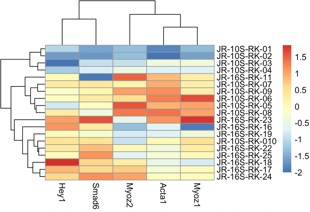 n=t(scale(t(dat[cg,]))) # 'scale'可以对log-ratio数值进行归一化