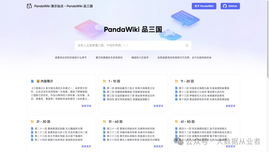 我们创建了一个叫做 “PandaWiki 品三国” 的知识库,录了一份 《三国演义》小说进去,效果如下: