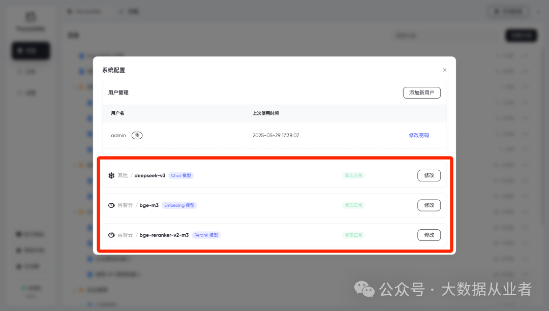 根据界面提示依次接入 “Chat 模型”、“Embedding 模型”、“Reranker 模型”。