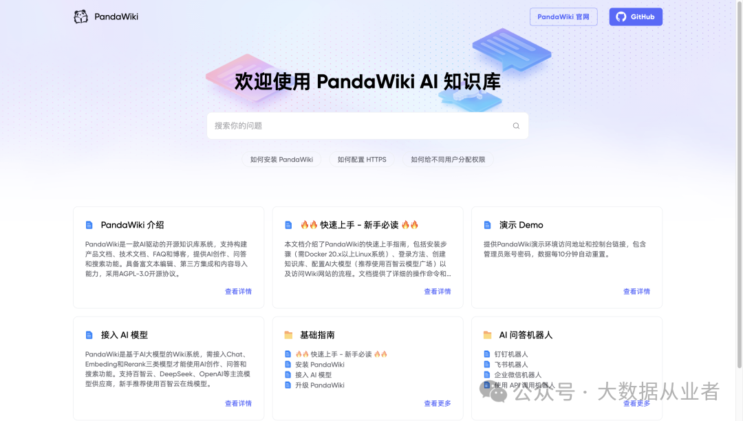 PandaWiki 是一款 AI 大模型驱动的开源知识库搭建系统,帮助你快速构建智能化的 产品文档、技术文档、FAQ、博客系统,借助大模型的力量为你提供 AI 创作、AI 问答、AI 搜索 等能力。