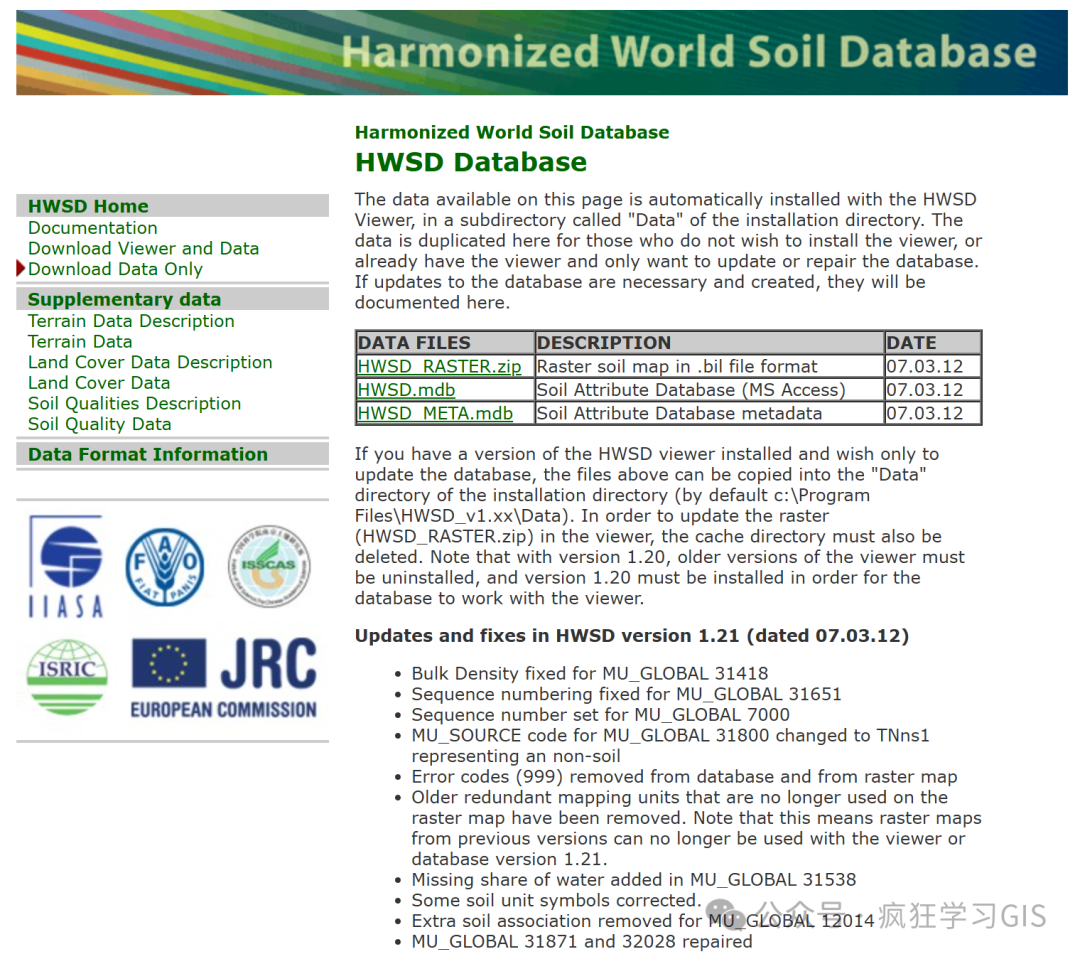 HWSD(Harmonized World Soil Database)即世界土壤数据库,是一个全球性的高分辨率土壤数据集;其是国际应用系统分析研究所(International Institute for Applied Systems Analysis,IIASA)与联合国粮食及农业组织(Food and Agriculture Organization of the United Nations,FAO)在一项针对全球部分地区的土地利用与覆盖变化模拟项目中诞生的产物。其包含丰富的土壤类型、相位、理化性质等信息,包括土壤类型、质地、有机碳含量、pH值、养分含量等多项指标,是地球系统研究和地理信息分析中非常重要的数据源;具体请见其官方文档。其空间分辨率为30"。