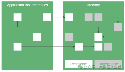 Java 应用程序不必负责释放已分配的内存,而是交给垃圾收集器完成。简而言之,GC 会观察哪些对象可以通过引用链从应用程序访问到,并释放那些无法访问到的对象。GC 需要跟踪堆空间中对象的状态来完成。例如,一个可能的状态是 “可到达”,这意味着应用程序持有对该对象的引用,该引用可能是传递性的,关键是应用程序可以通过引用访问这些对象。另一个例子是 “可终结”:就是无法访问的对象,这些对象被视为垃圾。