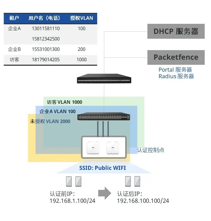 通过“Portal认证 + 动态VLAN”机制实现三重控制:验证接入终端、确认用户身份、基于身份授予网络访问权限。