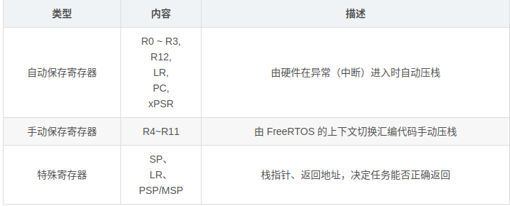 FreeRTOS 会将这些上下文信息 保存在任务的栈中,并把 栈顶指针(即当前任务运行到哪)记录在任务的 TCB 中。