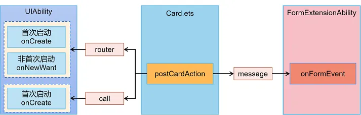 动态卡片中,官方提供了postCardAction接口用于动态卡片内部和提供方应用间的交互,和静态一致,也是仅支持router、message和call三种类型的事件,并且只能在卡片控件的点击事件中可以调用。