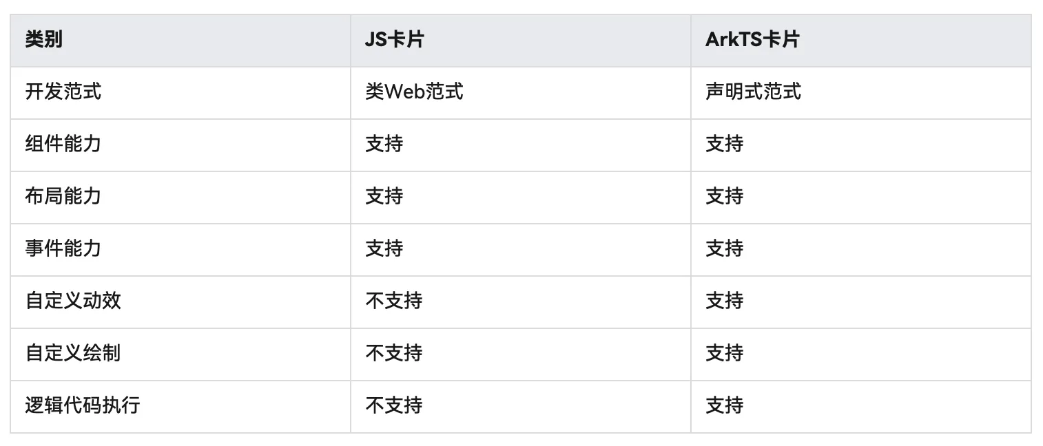 模型选择Stage之后,关于UI开发方式,这里也简单说一下,也是提供了有两种方式,一种是基于声明式范式ArkTS语言开发的卡片,还有一种则是基于类Web范式JS语言开发的卡片,记得之前在《了解项目的工程结构》一文中,有过重点概述,作为移动端应用的开发者,考虑到性能,复杂度高,开发效率和发展趋势而言,声明式开发方式,绝对是我们的首选方式,当然了,官方也是主推这种方式,所以关于卡片的创建,我们还是以声明式范式ArkTS语言为主,两者的主要区别如下: