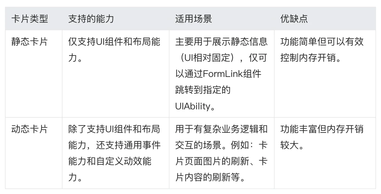 这两种类型的卡片,在整体的运行框架和渲染流程上是一样的,主要的区别是在于静态卡片渲染服务将卡片内容渲染完毕后,卡片的使用方会使用最后一帧渲染的数据作为静态图片显示,其次卡片渲染服务中的卡片实例也会释放该卡片的所有运行资源以节省内存;这样就会导致频繁的刷新会使得静态卡片运行时资源不断的创建和销毁,增加卡片功耗。
