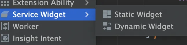 当我们去创建一个卡片时,可以发现,有两种选择,一种是Static Widget,也就是静态卡片,另一种是Dynamic Widget,也就是动态卡片,在对应的模块右键点后,找到服务卡片Seivice Widget,如下图所示: