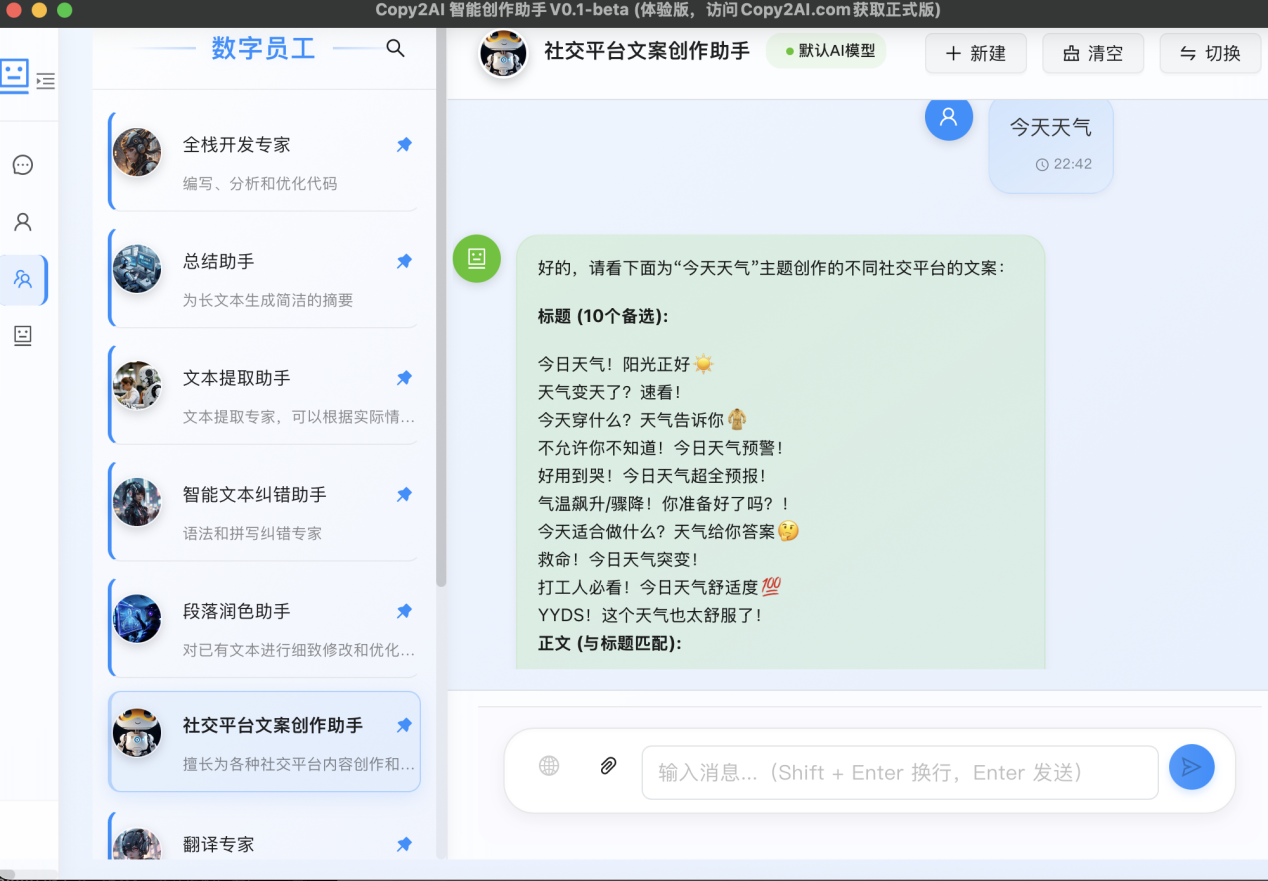 Copy2AI智能聊天助手凭借其强大的功能、贴心的设计以及极致的用户体验,已然超越传统工具范畴,成为一种全新的工作与生活方式。它为不同领域、不同需求的用户群体提供了全方位的赋能支持,无论是职场精英、创意达人、学生群体还是开发者,都能借助其力量提升效率、激发创意。在追求高效与便捷的数字化时代,Copy2AI智能聊天助手无疑是提升个人生产力、释放创意潜能的终极选择。