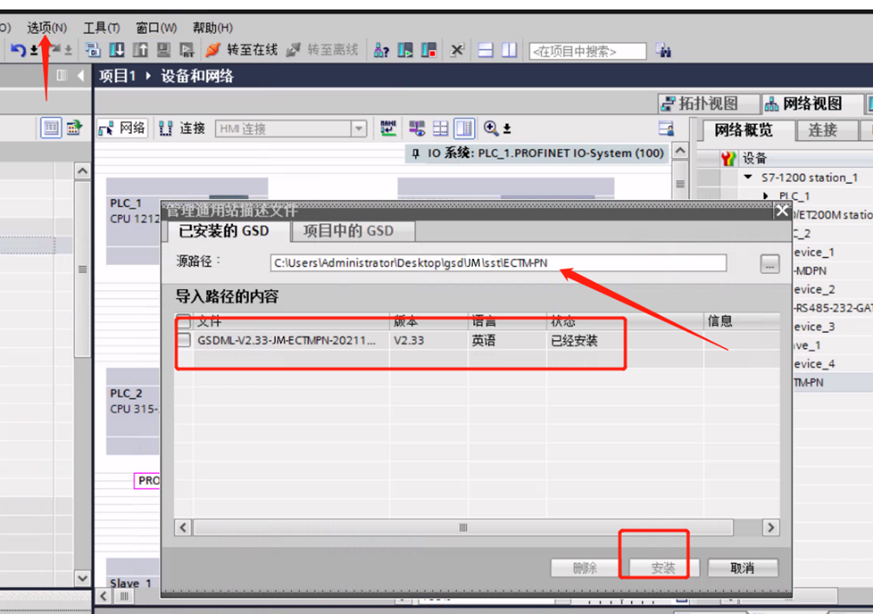 打开选项-管理通用站描述文件-选择捷米JM-ECTM-PN的gsd文件放的位置-勾选文件前面的框-点击安装,由于我已经安装过了,所以该选项为灰色。