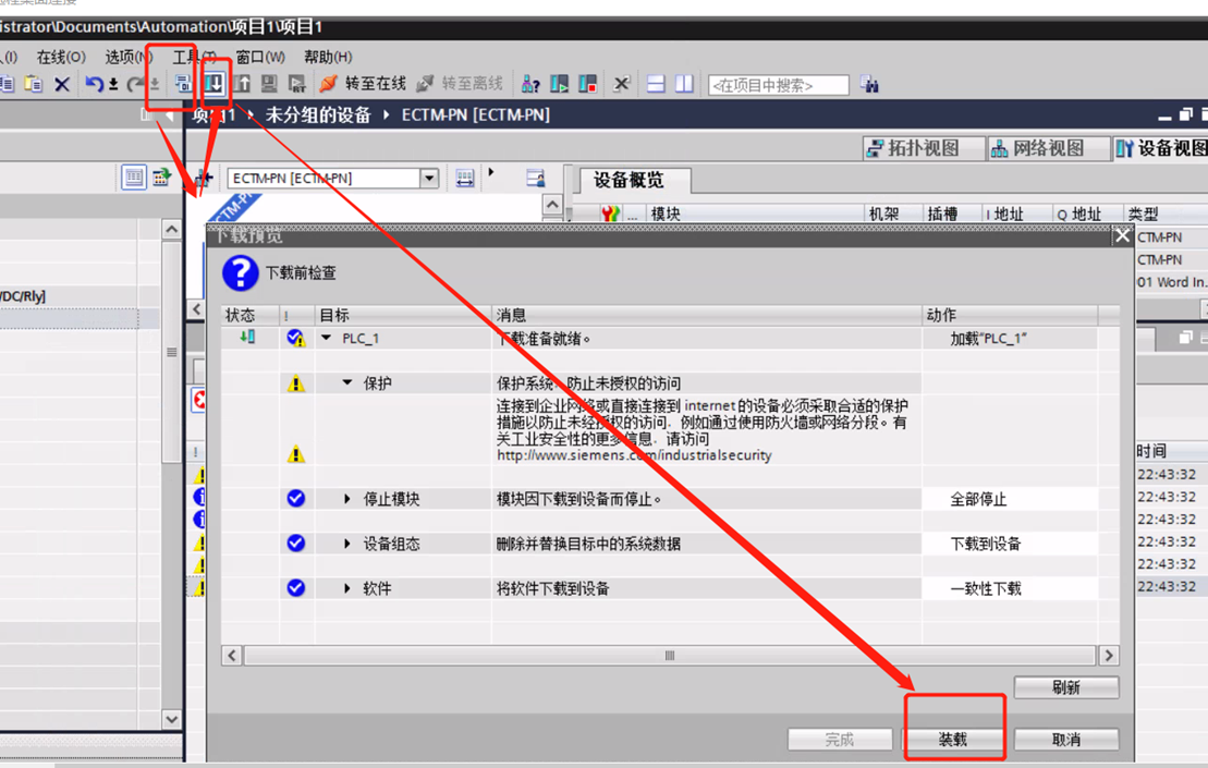 5、plc端的数据已经添加完毕,现在可以把组态下载到plc,如图: