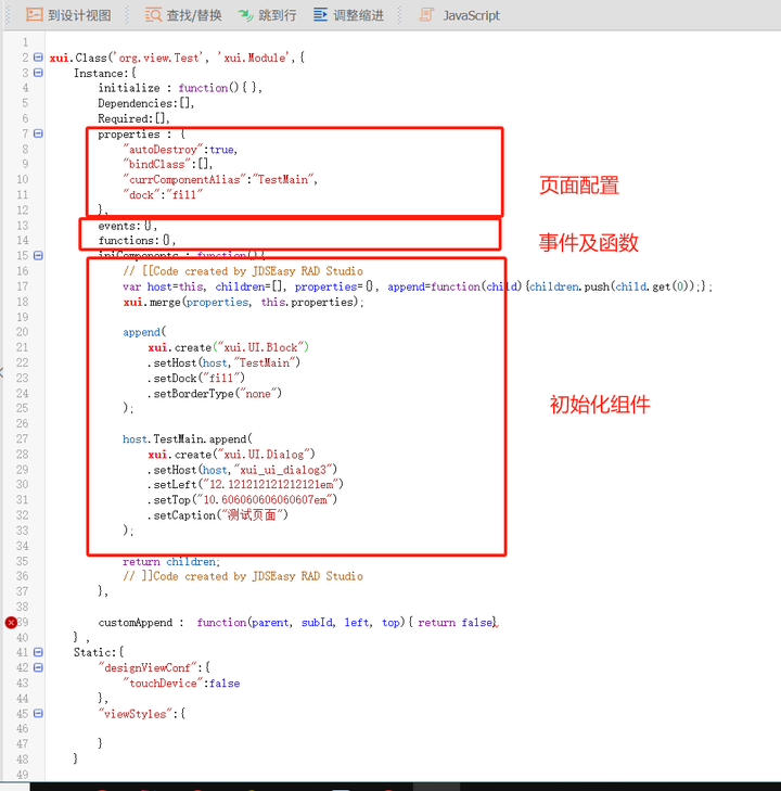 }从代码结构上来看,构建了一个,自定义的Class JS类,类的命名空间:org.view ,继承于xui.Module。,2