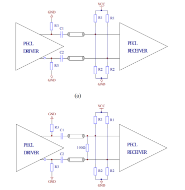 (1)增加一个与耦合电容串联的电阻,使得PECL 驱动器端的等效交流阻抗接近50Ω;