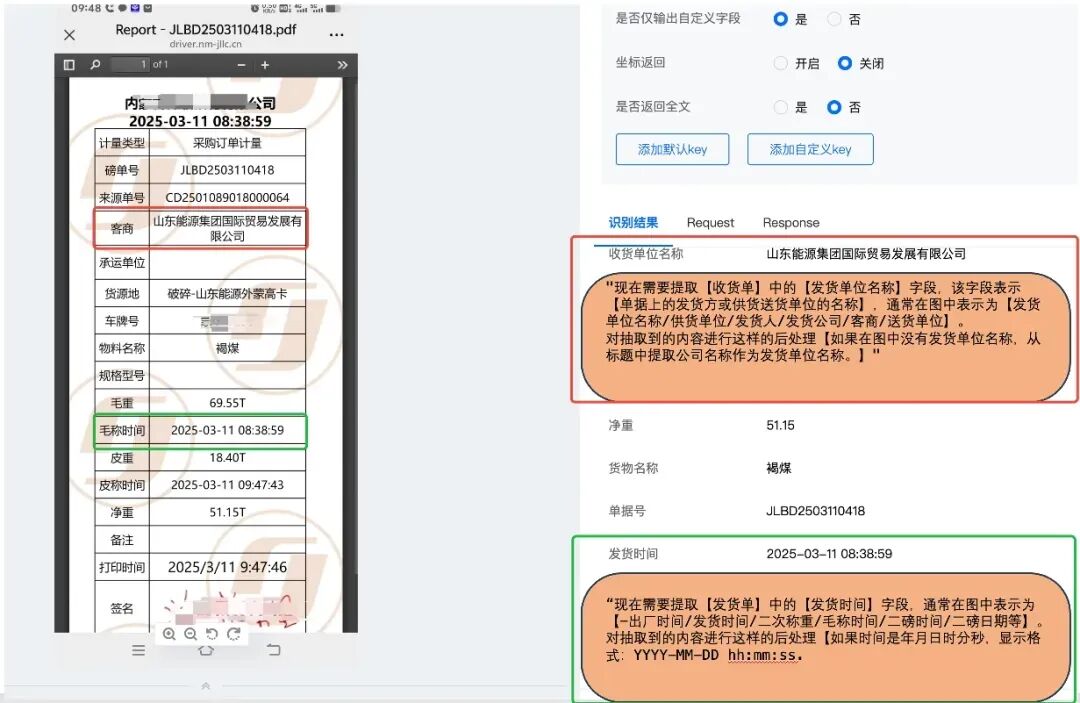 4)Prompt自定义能力:提取固定 Key 内容,按照自定义需求从图中提取关键字段信息。