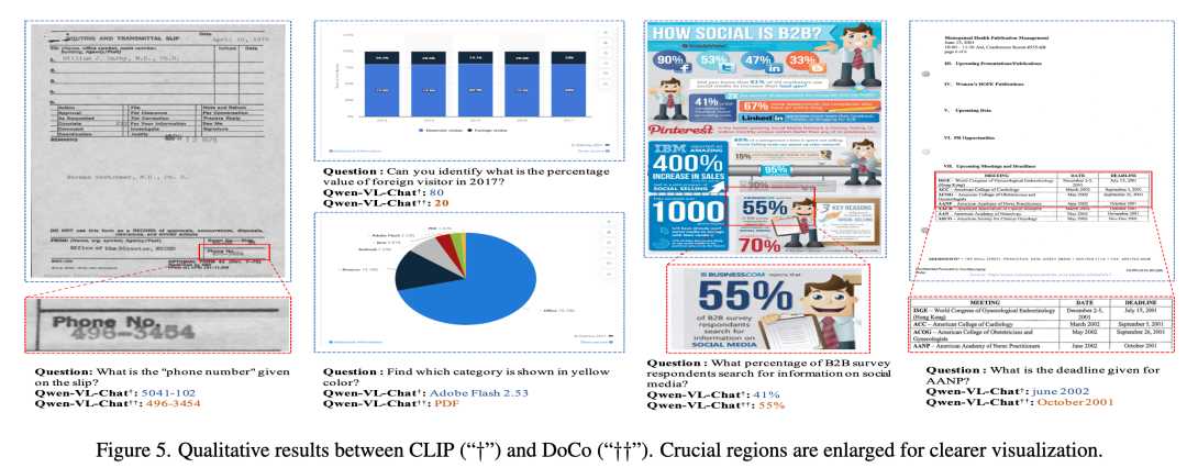 从图表和文档问答的实际表现中可以看出,文档细粒度对比学习在回答精准度上相比于业界常用的 CLIP 技术方案,有比较好的提升。