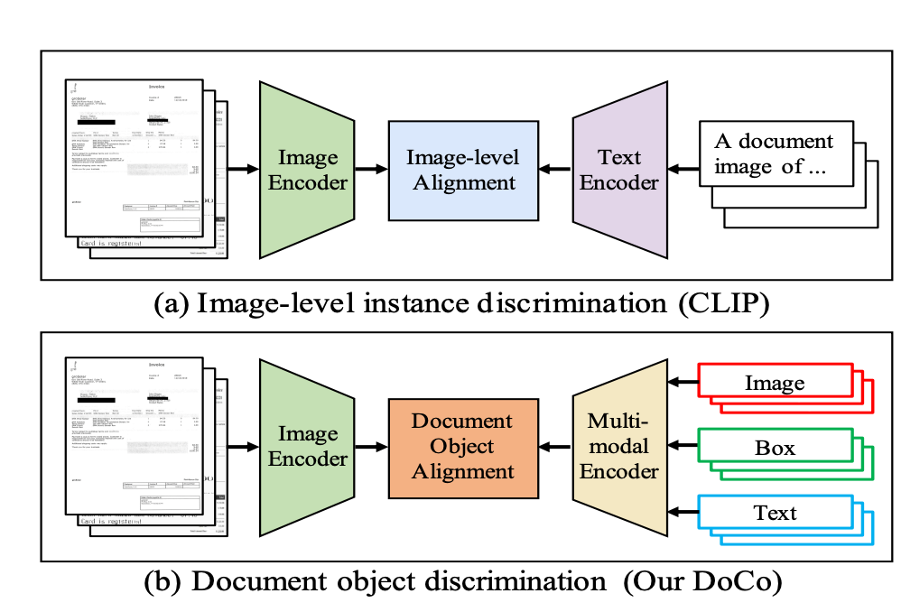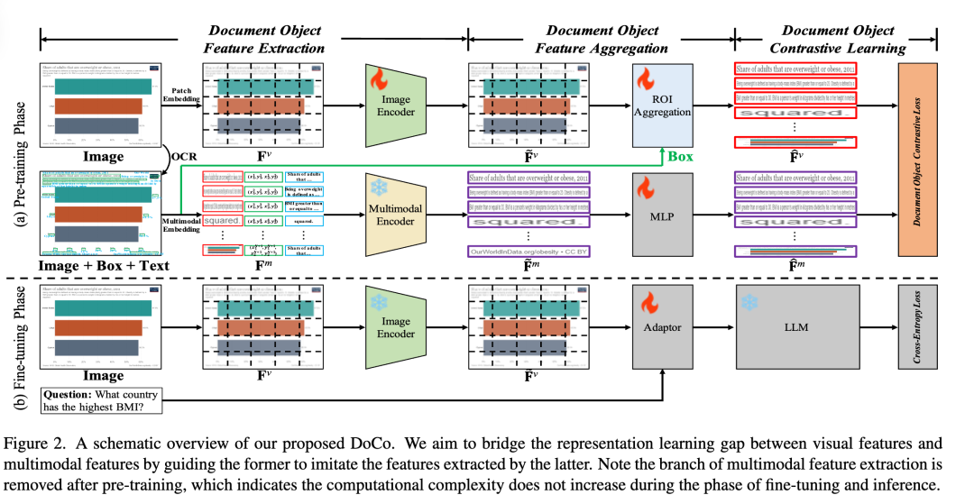 文档对象对比学习(DoCo),专为VDU(文档智能理解)的下游任务设计。DoCo利用辅助文档多模态编码器获取文档对象的特征,并将其与LVLM视觉编码器生成的视觉特征对齐,从而增强文本密集场景中的视觉表示。对比学习文档对象的视觉整体表示和多模态细粒度特征,可以帮助视觉编码器获取更有效的视觉线索,从而提升LVLMs对文本密集文档的理解。