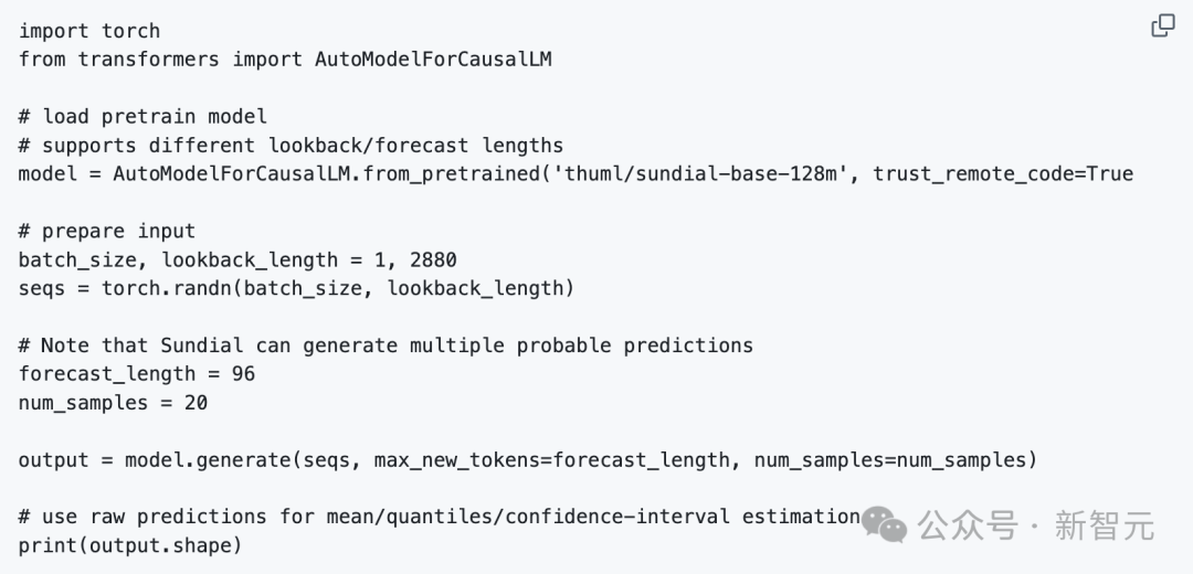 目前 HuggingFace 上开源了基础模型,仅需不到十行代码,就可调用模型进行零样本预测,并提供了均值预测,分位数预测,置信区间预测等示例。