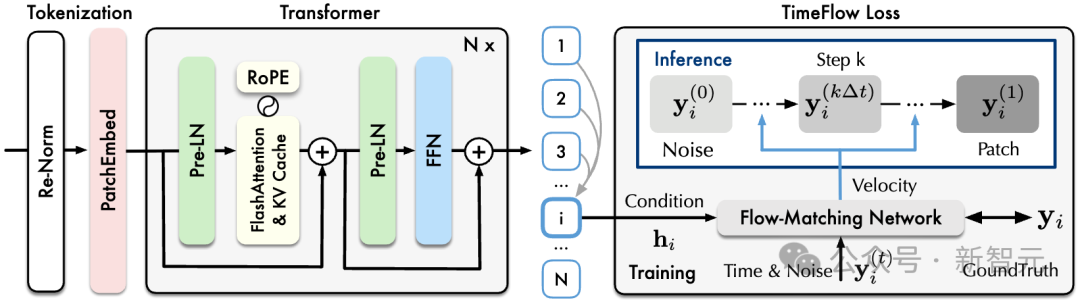 基于Transformer提取的上下文表征,研究人员提出时间流预测损失(TimeFlow Loss),将历史序列表征作为生成条件引入到流匹配过程中。