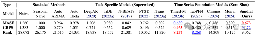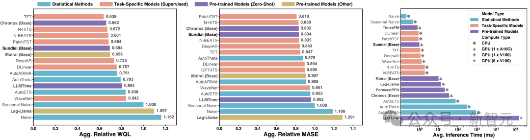 GIFT-Eval 为 AutoGluon 发布的预测榜单,包含27个数据集,指标从左到右依次为:概率预测(WQL),点预测(MASE)和推理时间(ms)