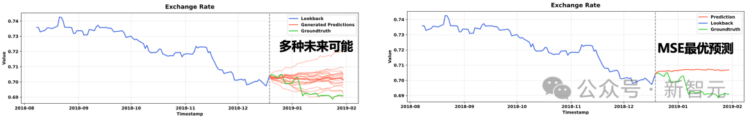 在大规模时序数据的复杂异构分布上训练,以往模型往往给出「过平滑」的预测结果(上图右)。
