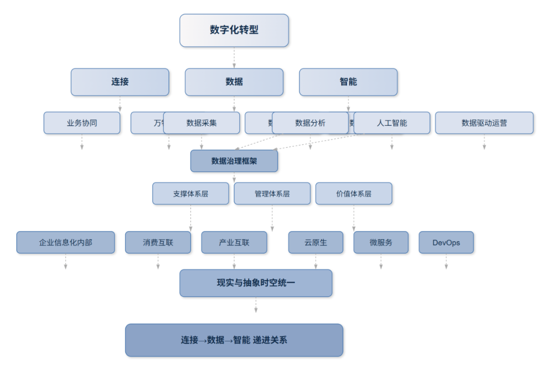 图中使用虚线箭头表示层级间的逻辑递进关系,蓝色系渐变配色突出了不同层次的重要性,整体呈现出数据治理从顶层设计到落地实施的完整架构体系。