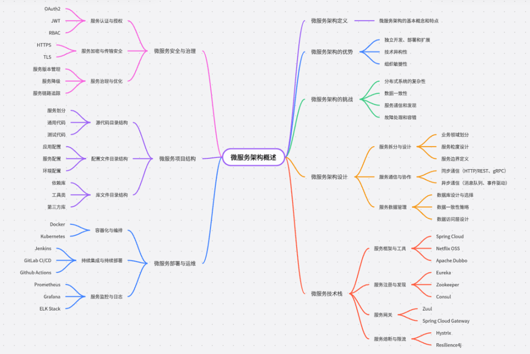 类似我当时借助AI很简单的即可实现微服务架构知识结构思维导图:
