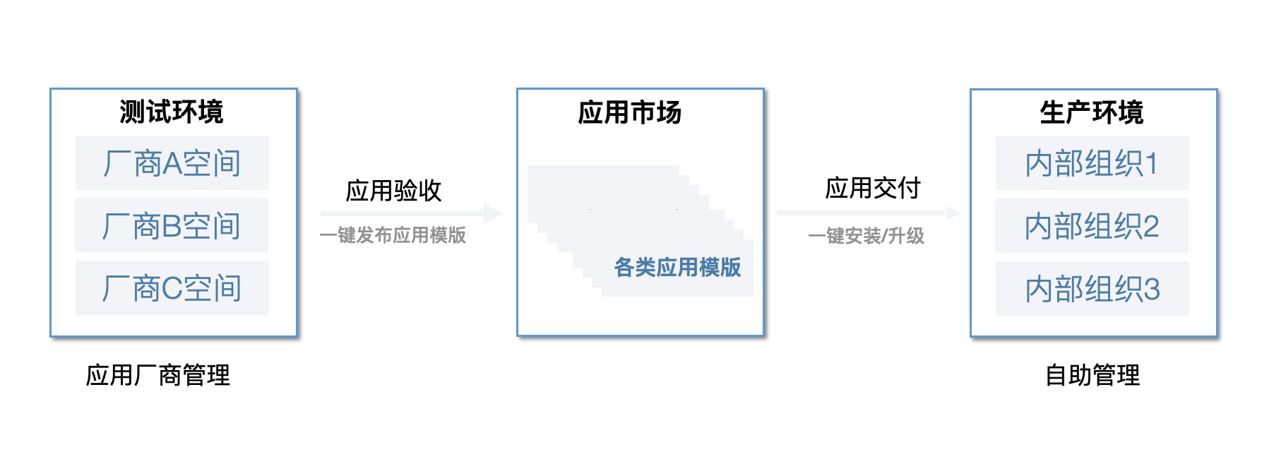 Rainbond的供应商交付管理解决方案,为企业与供应商的协作提供了“尚方宝剑”。它能为每个供应商提供独立的、安全的、资源可控的测试环境,互不干扰。更核心的是,供应商在Rainbond中测试通过的软件,可以一键发布为标准的“应用模版”。企业信息化部门在生产环境中,可以直接基于此模版一键安装部署,省时省力。当供应商有新版本或Bug修复时,只需在测试环境验证通过后更新应用模版,生产环境即可实现业务不中断的一键升级。整个交付、测试、上线、升级的每一步都清晰可追溯,让企业“管理更安心”,真正掌控与供应商的协作全局。