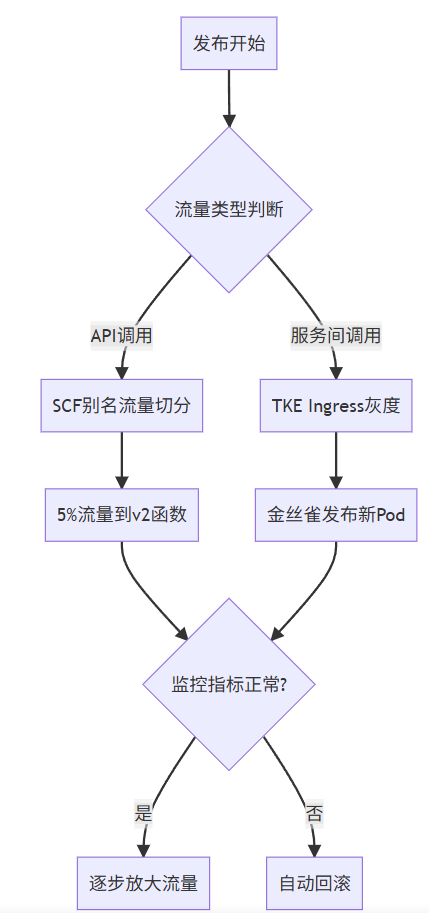 图解:API调用通过SCF别名控制,服务间调用通过K8s Ingress实现双轨灰度
