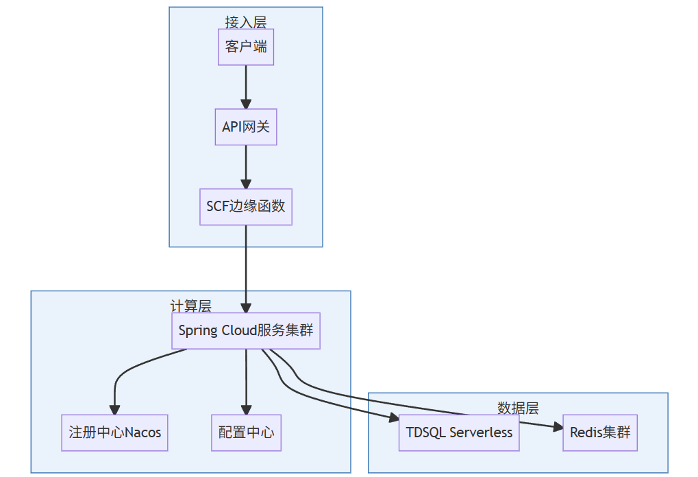 图解:三阶架构明确分层,接入层处理流量调度,计算层运行Spring Cloud微服务,数据层完全Serverless化