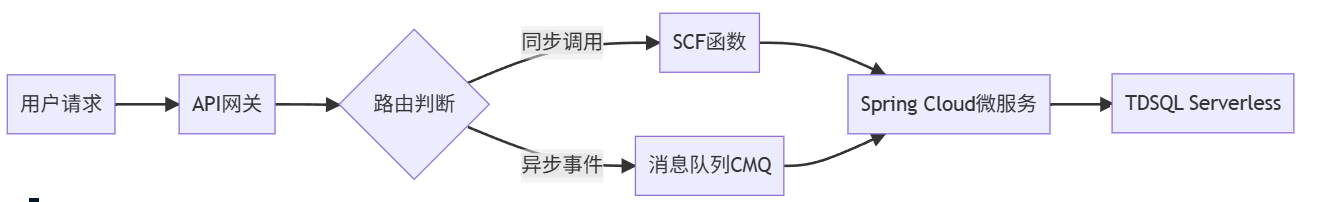 图解:请求通过API网关动态路由,同步调用直接触发SCF函数,异步场景经消息队列解耦,最终访问Spring Cloud微服务集群