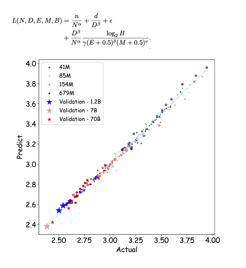 浮点数的量化结构复杂,由符号位、指数位和尾数位决定。研究团队发现,特定的指数位(E)与尾数位(M)配置关系直接影响模型的训练效果。他们推导出,在任意配置下,都存在一个模型的极限性能与数据量的关系,“超过这个临界点(Dcrit)后,继续增加数据反而会对模型效果产生负面影响”。这一发现对理解大模型在实际训练中的行为模式具有重要意义。
