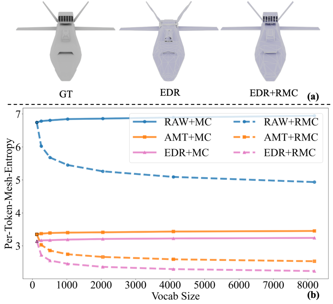 在当前自回归网格生成方法体系中,下一坐标预测范式已成为实际落地的主流方案 。这类方法虽能在网格序列化建模流程中实现一定效果,但在网格标记器质量评估环节,既缺少无需训练即可从理论层面高效评估的手段,现有标记器对网格序列的压缩能力,也存在明显优化空间 。