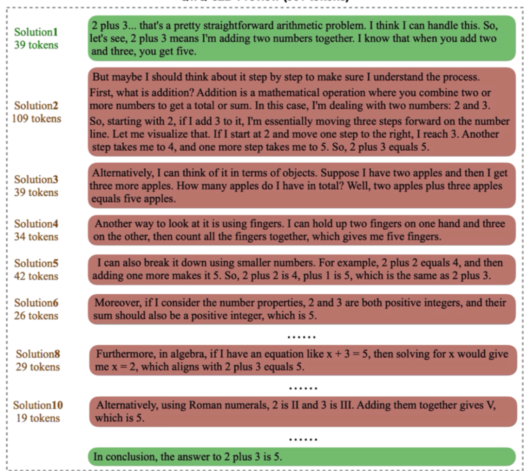 来自腾讯和上海交通大学的研究者针对长推理模型的生成效率进行了详细的研究。他们发现,长推理模型存在严重的“过度思考现象”:长推理模型在生成答案过程中,会对单一问题生成冗余的同质化解答 (solution),且后续解答对正确率贡献较低。进一步的分析发现,过度思考现象有如下三个特点:1. 冗余解答对正确率贡献较低。2. 冗余解答的策略多样性较低。3. 过度思考现象在简单问题上更严重。