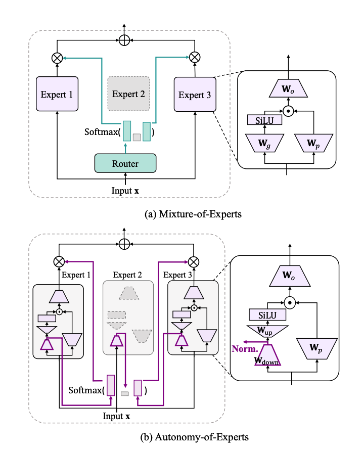 近年来,Mixture-of-Experts(MoE)模型因其提升大语言模型参数利用率与计算效率的能力,受到学术界与工业界广泛关注。然而,现有MoE普遍依赖外部路由器选择专家,这种“决策与执行分离”的架构存在关键问题:路由器无法感知专家真实能力,导致专家选择缺乏有效监督,易引发训练损失上升或专家能力漂移,训练效率低下。