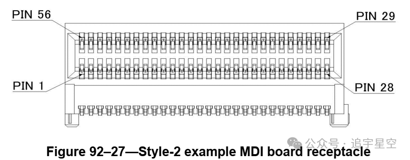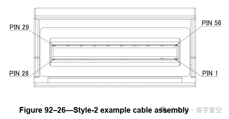 电缆组件两端的插塞连接器应为SFF-8665中定义的QSFP+28 Gb/s 4X可插拔(QSFP28)插头,如图92-24所示。MDI连接器应为QSFP+28 Gb/s 4X可插拔(QSFP28)插座,具有SFF-8665中定义的机械配合接口,如图92-25所示。这些连接器的触点分配如表92-15所示,电气性能符合信号质量和电气要求。