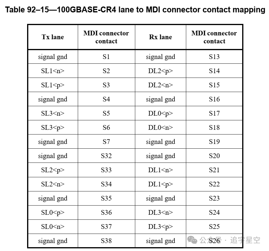100GBASE-CR4 PMD的Style-2 MDI连接器包括56个信号连接。样式2 100GBASE-CR4 MDI连接器触点分配应如表92-16所示。请注意,源通道(SL)、信号SLi<p>和SLi<n>是发射机差分信号对的正侧和负侧,目的通道(DL)信号DLi<p>和DLi<n>是通道i(i=0,1,2,3)的接收机差分信号对正边和负边。